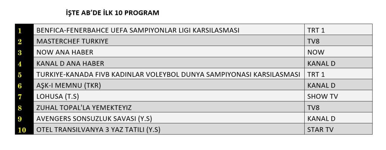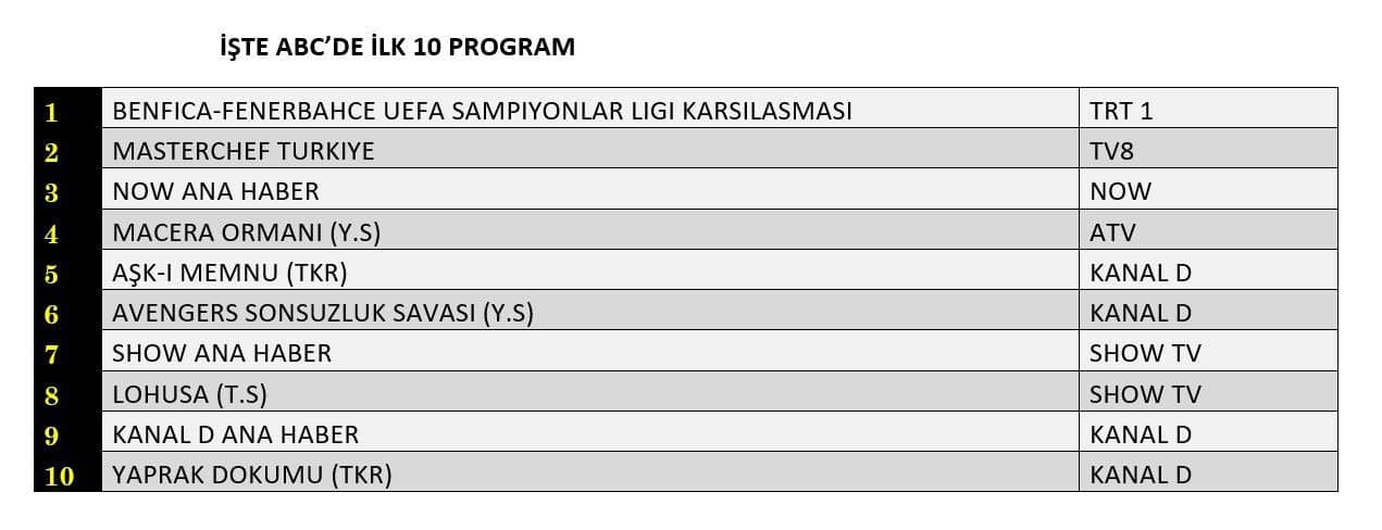 🏆 Группа ABC, включающая зрителей из крупных городов, повторила эту тенденцию без единого изменения! Матч «Бенфика-Фенербахче» безраздельно царствовал на вершине, не оставив конкурентам ни малейшего шанса. Удивительная стабильность результатов across all categories — разве это не доказывает всеобщую любовь к футболу? «MasterChef Турция» прочно закрепился на второй позиции, в то время как «NOW Ana Haber» довольствовался почётным третьим местом.